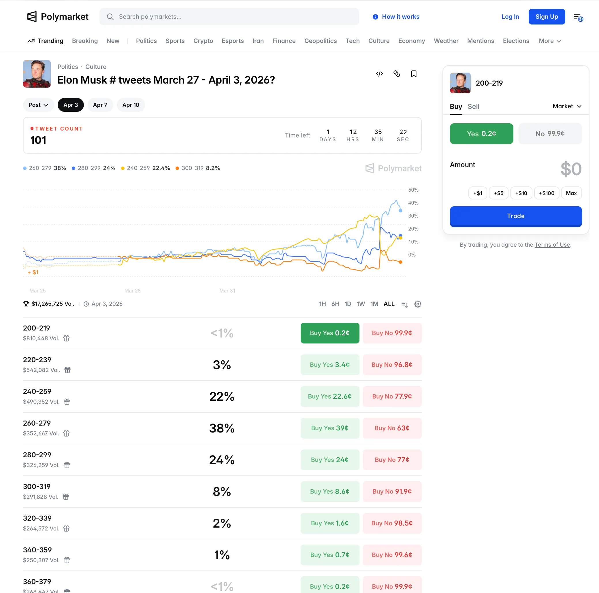 每个周期有多个投注区间,每个区间都有 YES / NO,可以中期投注/卖出,每个事件的总投注资金量在1000万美刀左右。