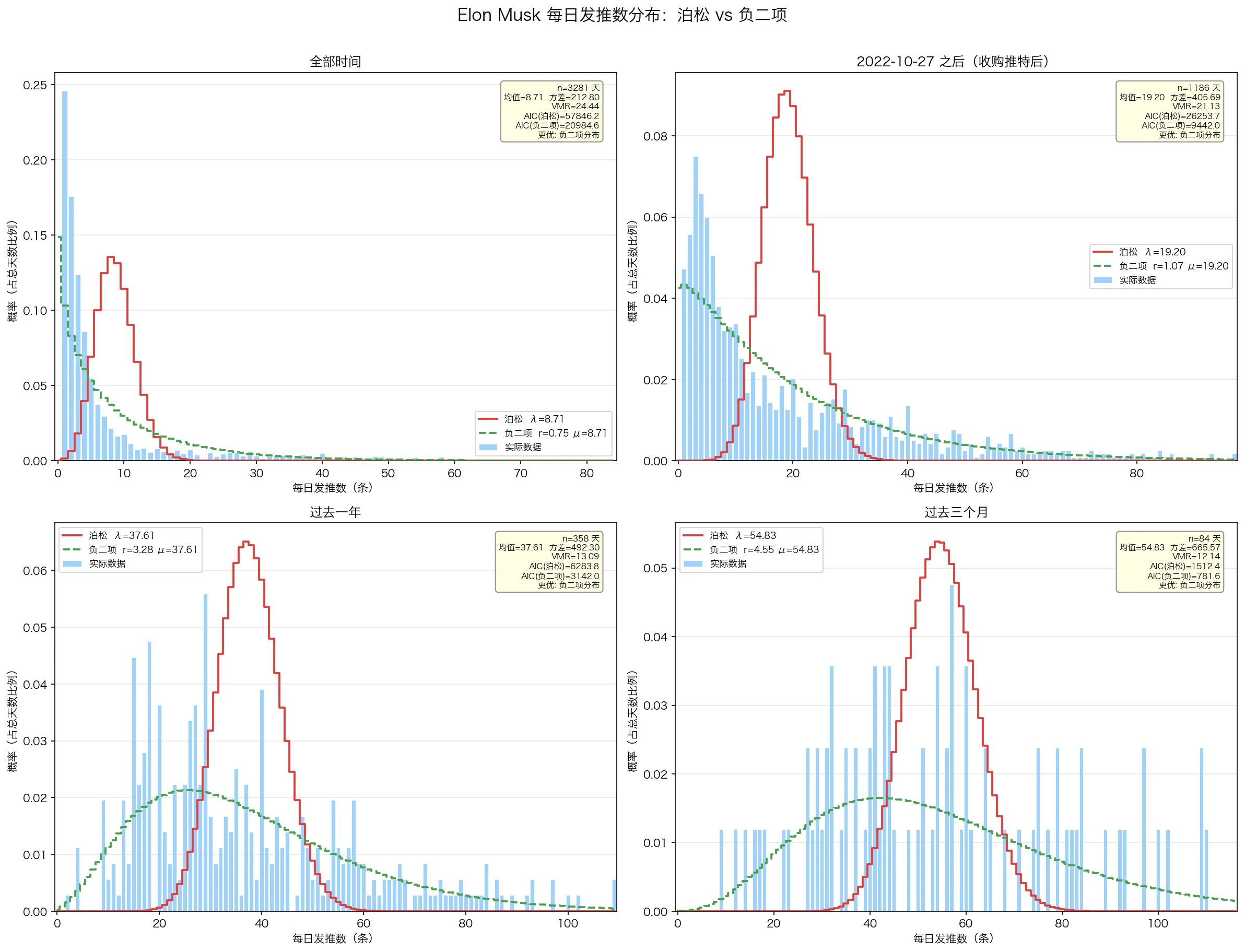 从分布的角度来说,Elon Musk 的 tweets 条数更符合负二项分布(一开始以为会更符合泊松分布一些,但是泊松分布要求方差 = 均值,这里过离散性显著存在。)