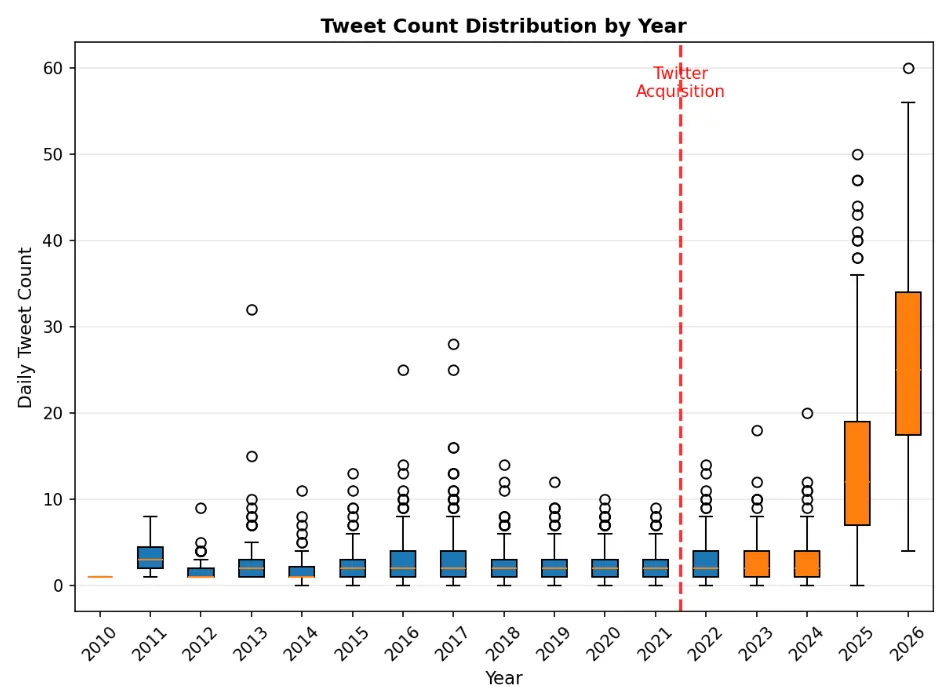 可以看到,收购 Twitter 之后,Elon Musk 的发推条数显著上升,在 2025 年到 2026 年更是节节攀升。(这里说明收购Twitter之后和2024年以后数据可能发生了显著的断层,所以后续处理时这是一个重要的选项(使用哪个周期的数据?or使用滚动数据?))