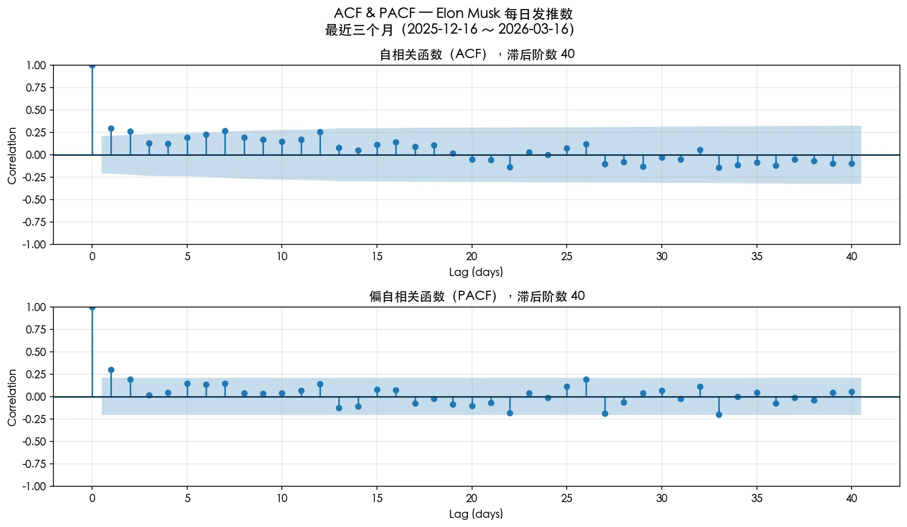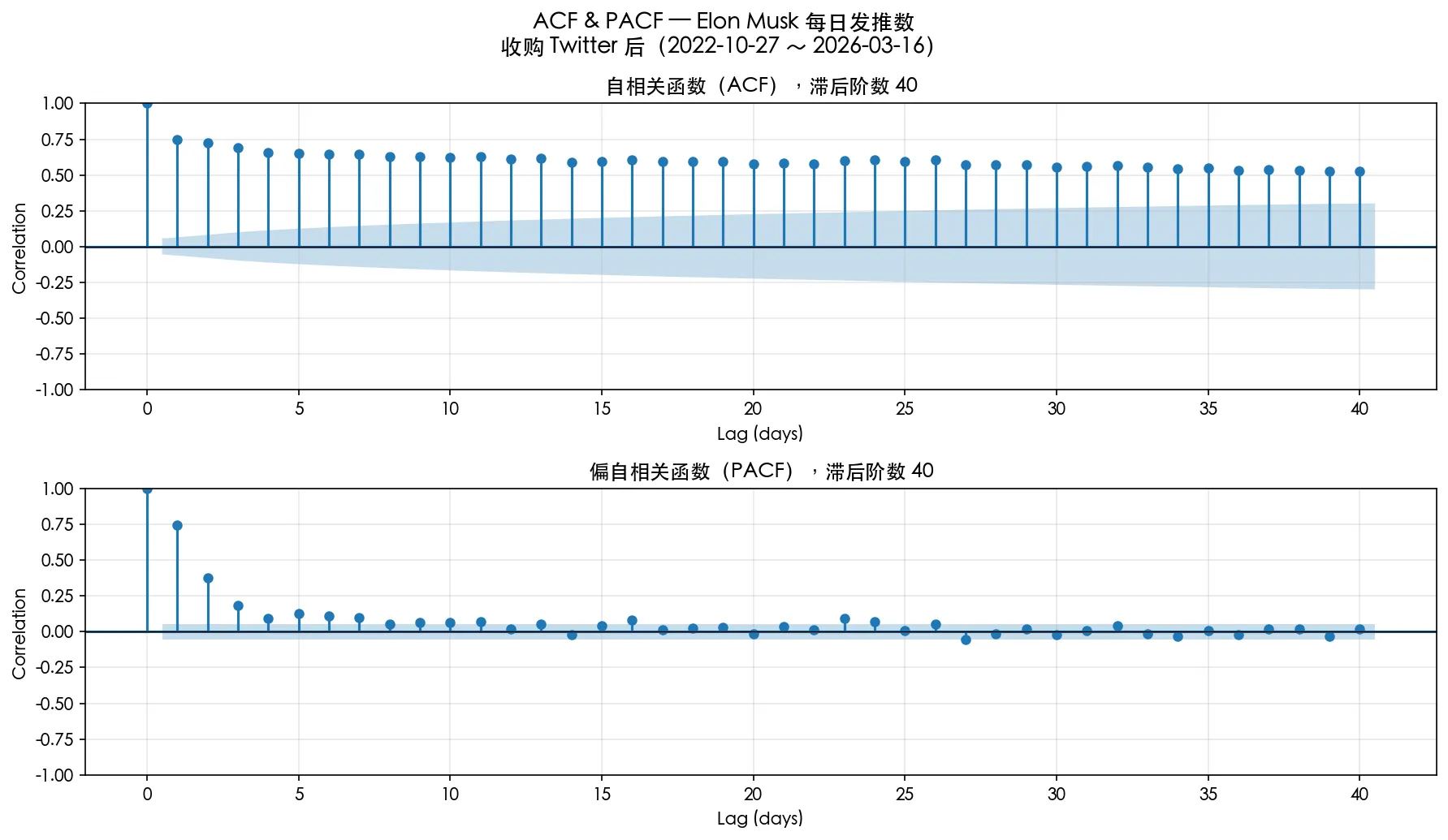 我们分别考察 过去 3 个月,过去 1 年,收购 twitter 后这三个时间的 ACF 和 PACF,蓝色阴影以外是 95% 置信度区间。
