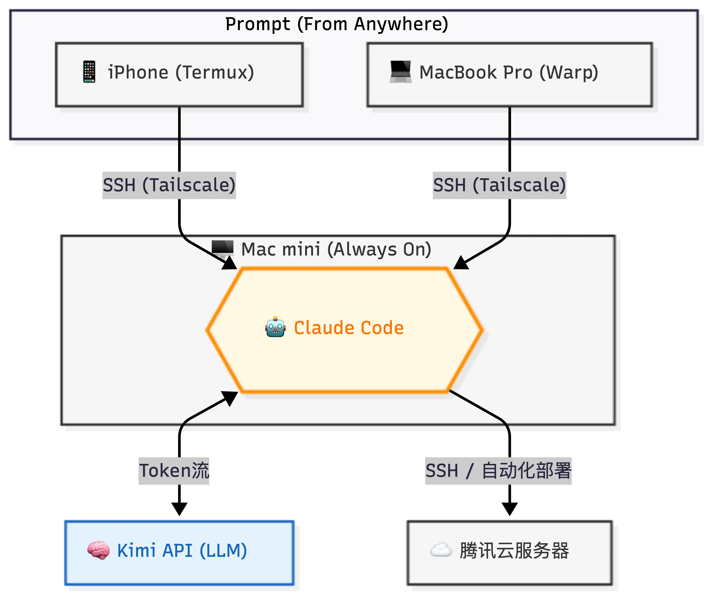 简单来说,我在Mac Mini上部署了Claude Code,给其接入了Kimi 2.5,并教会了它如何使用我的腾讯云服务器。由于我的Mac Mini放在宿舍,没有公网ip,需要使用tailscale做内网穿透。然后我就可以在地铁上、厕所里用手机里的Termux(terminal)写Prompt,让其自主工作。
