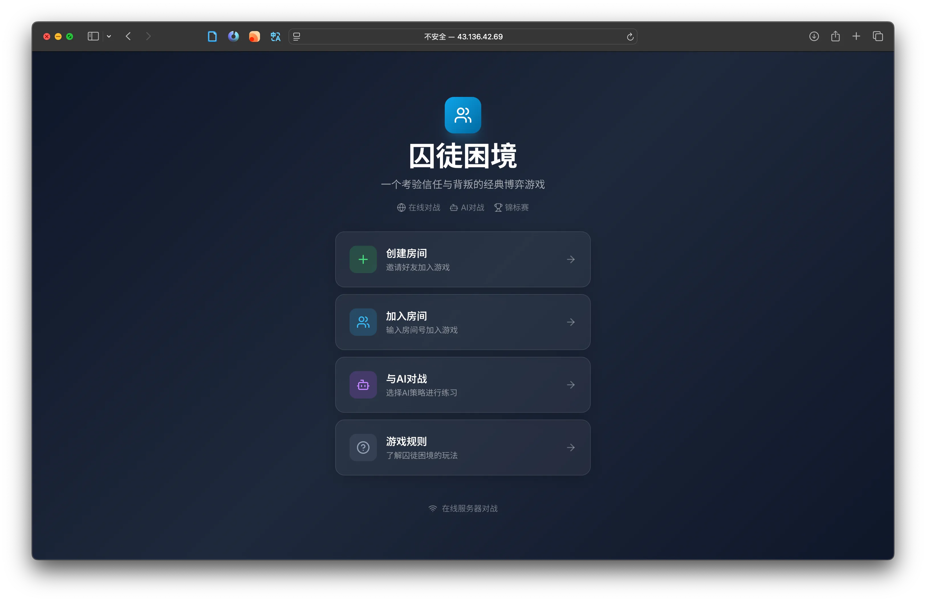 - 重写我大一handcode的囚徒困境游戏网站 ↗,实现非同一局域网联机功能,并大幅度优化UI设计。
