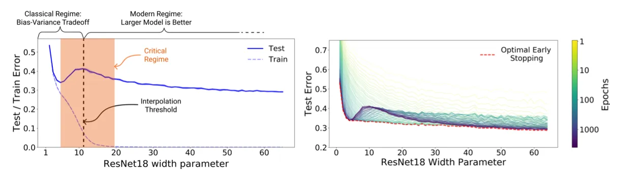 这样反常的现象是如何出现的?为什么参数量的升高一开始会导致Test Error的升高,但是过了波峰之后Test Error再次降低,乃至于比原来的波谷更低?