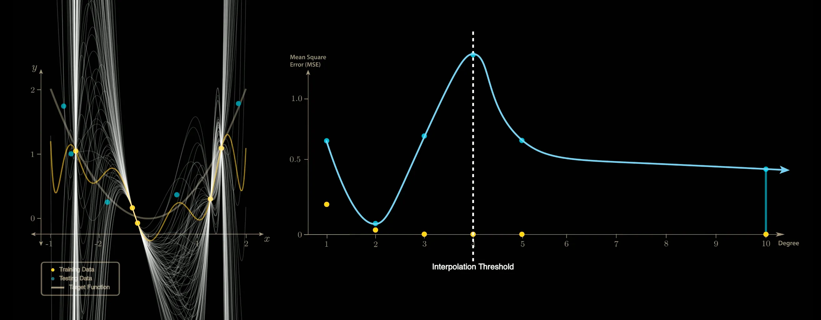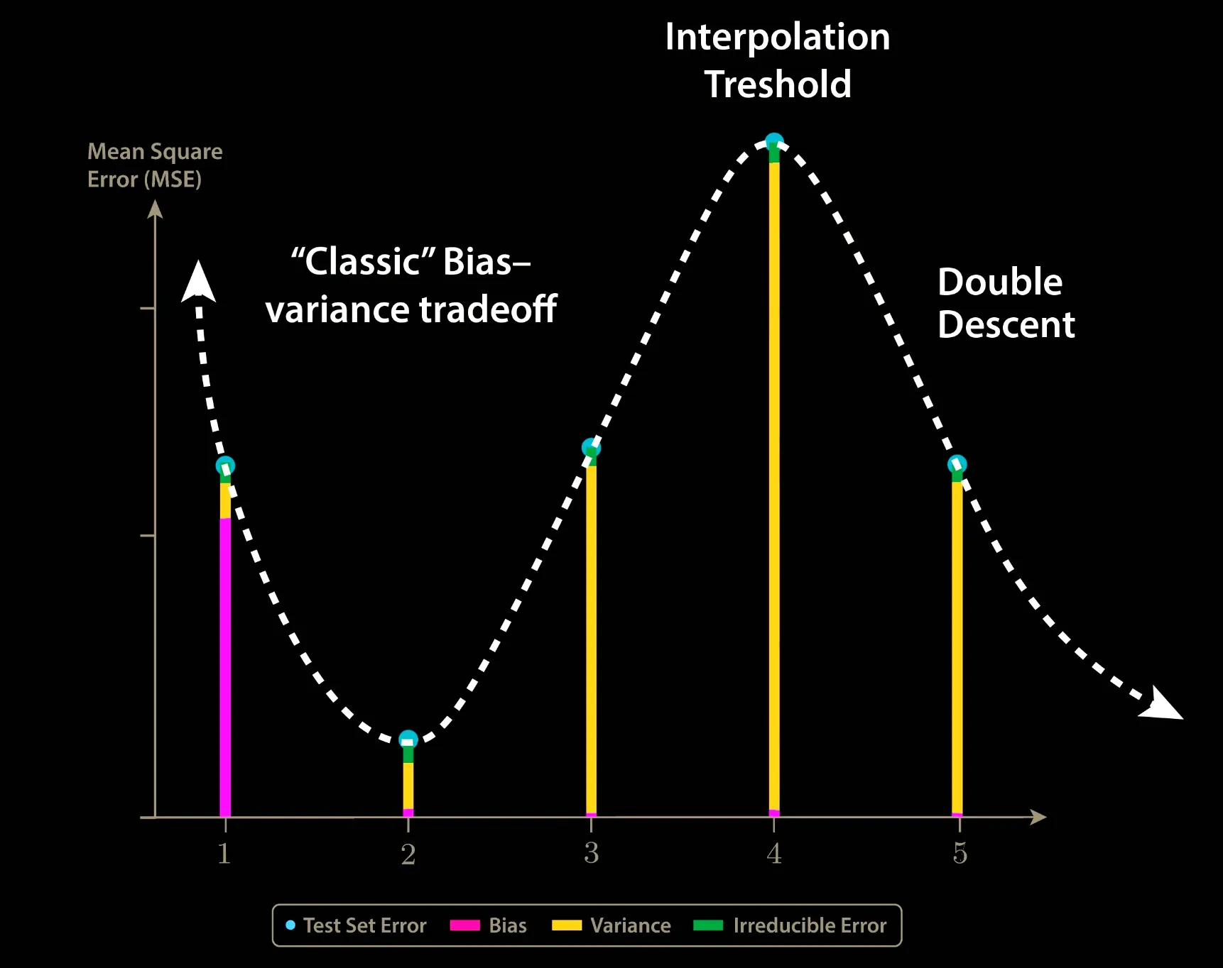 1.在插值阈值之前,模型没有足够的参数完美拟合所有点(没有完美解),我们只能用Variance来换Bias。