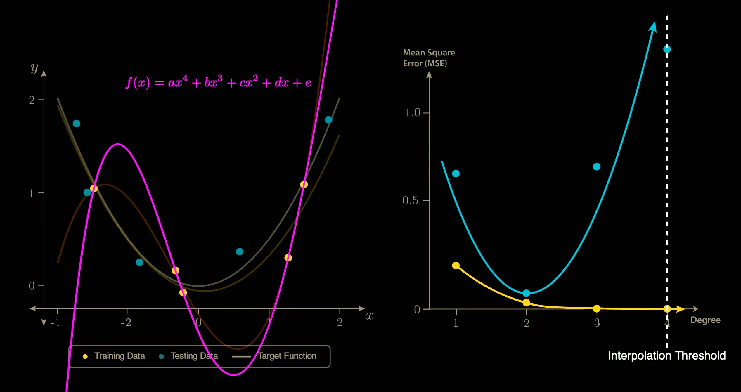 显然,1~3次多项式都不能保证经过Training Set中的全部5个数据点,到了4次多项式刚好有一条曲线可以全部经过,到了5次6次等大于4的更高次,则有无数种曲线可以经过5个数据点。(顺便一提,在这个简单的多项式拟合问题中,4次这个点就是这个数据集的插值阈值Interpolation Threshold)