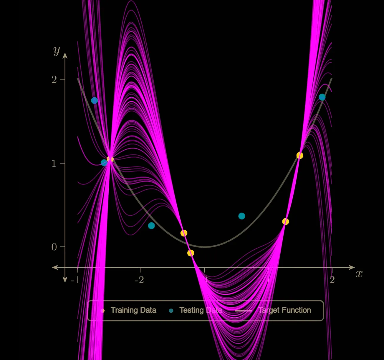 但是当多项式次数到达5之后,有无数种多项式曲线可以穿过这5个点。