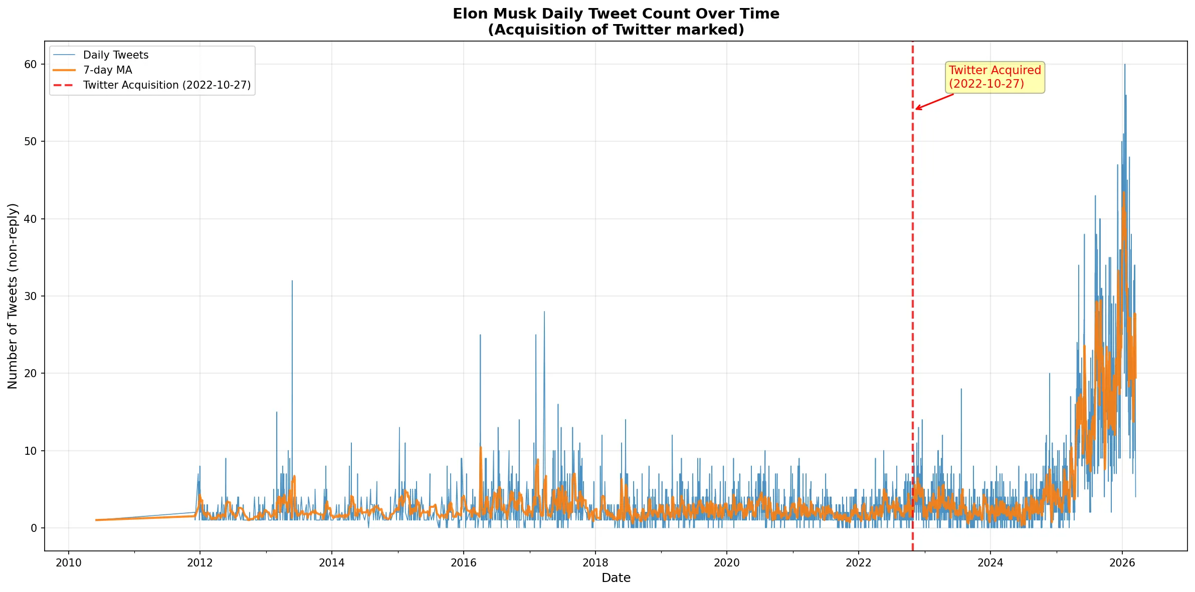 可以看到,收购 Twitter 之后,Elon Musk 的发推条数显著上升,在 2025 年到 2026 年更是节节攀升。(这里说明收购Twitter之后和2024年以后数据可能发生了显著的断层,所以后续处理时这是一个重要的选项(使用哪个周期的数据?or使用滚动数据?))