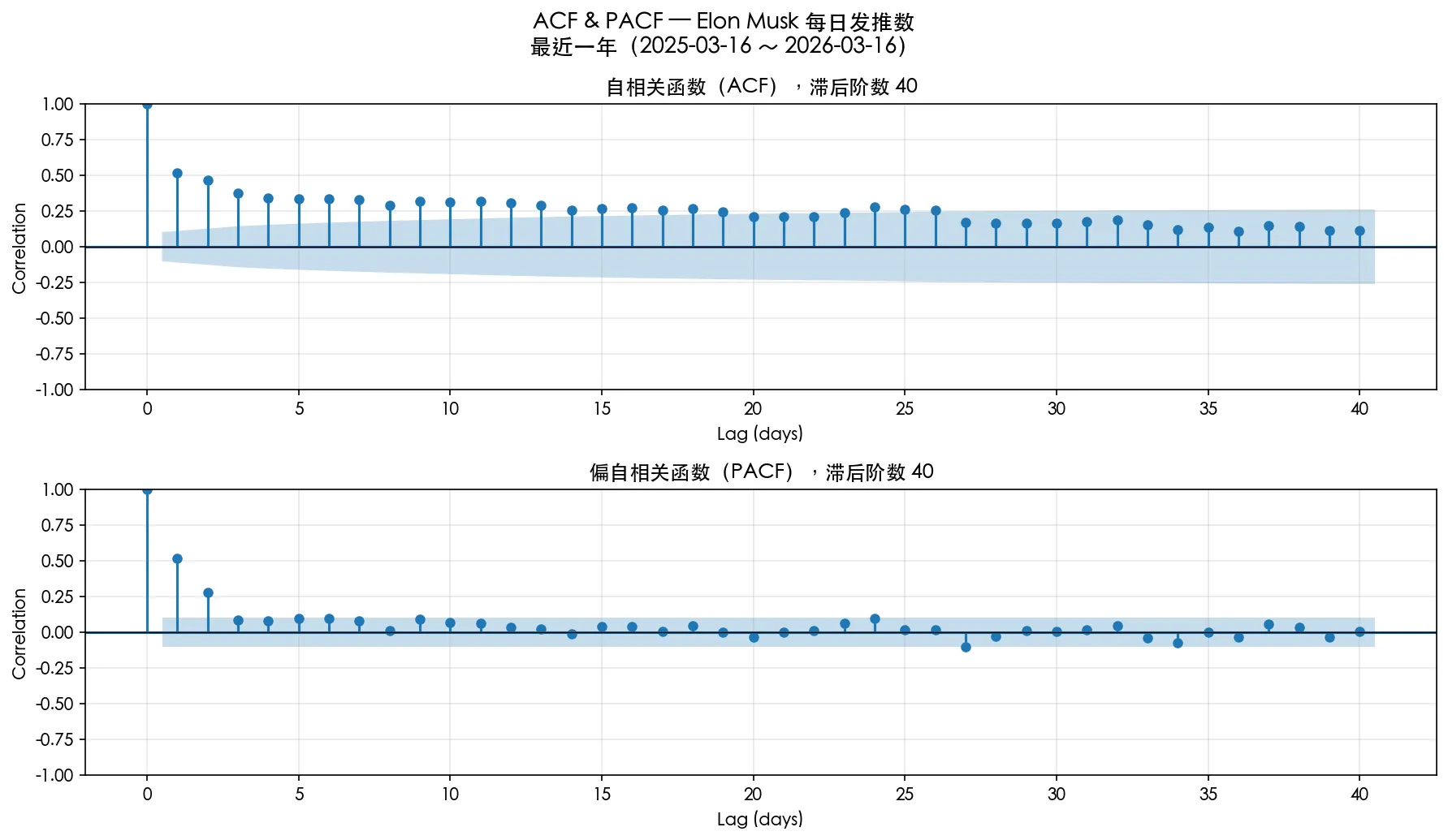 我们分别考察 过去 3 个月,过去 1 年,收购 twitter 后这三个时间的 ACF 和 PACF,蓝色阴影以外是 95% 置信度区间。