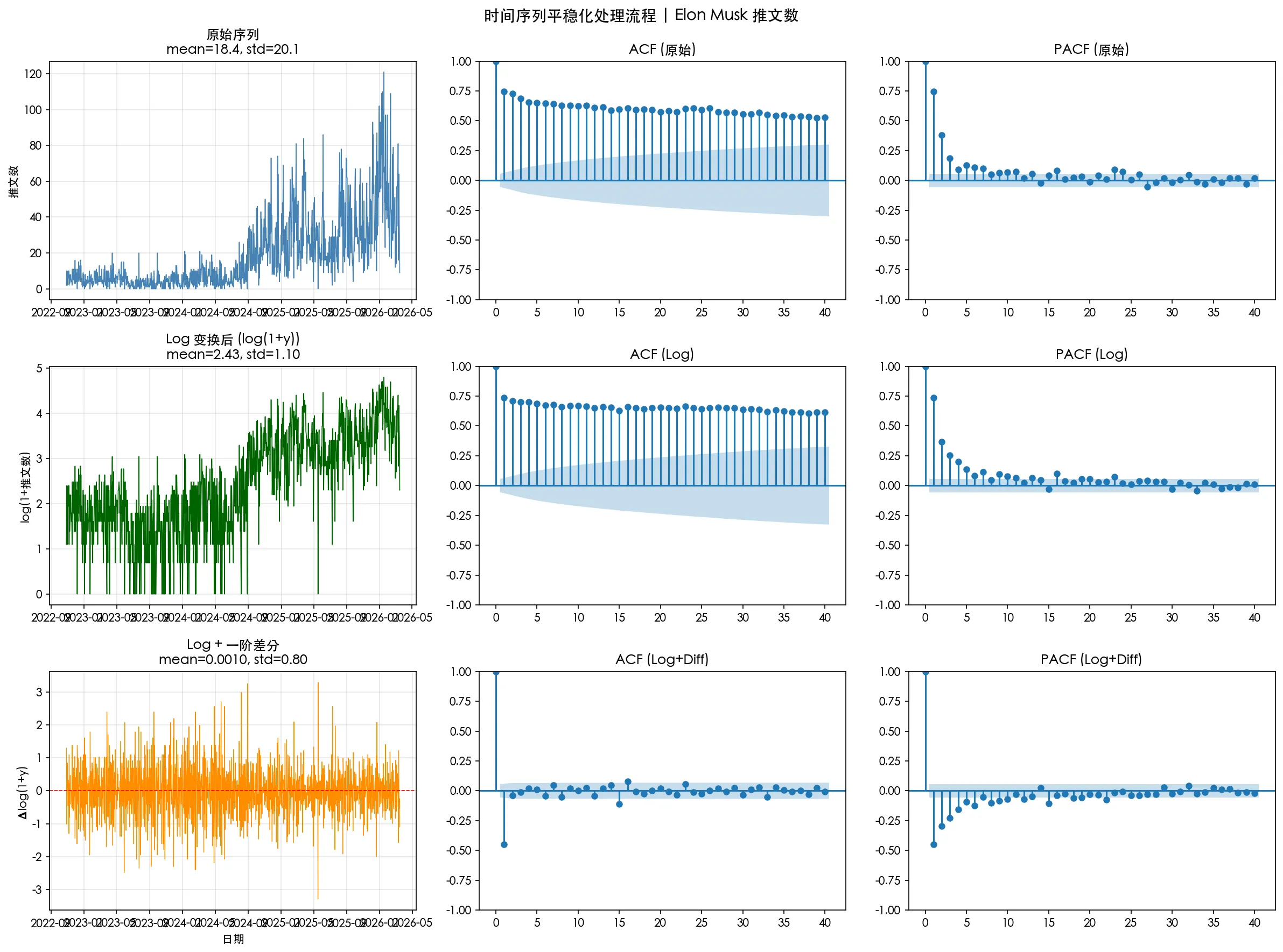 只有 log + 差分通过了 ADF 检验。