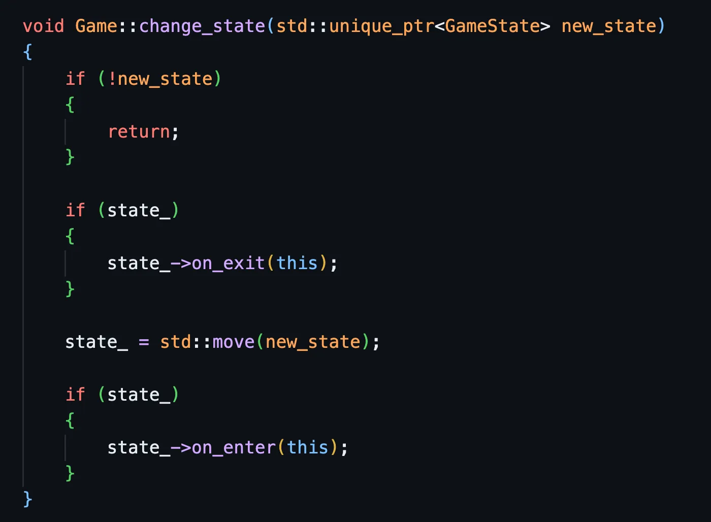 GameState一个基类和多个...State子类,通过改变changeState来将各个状态分开。