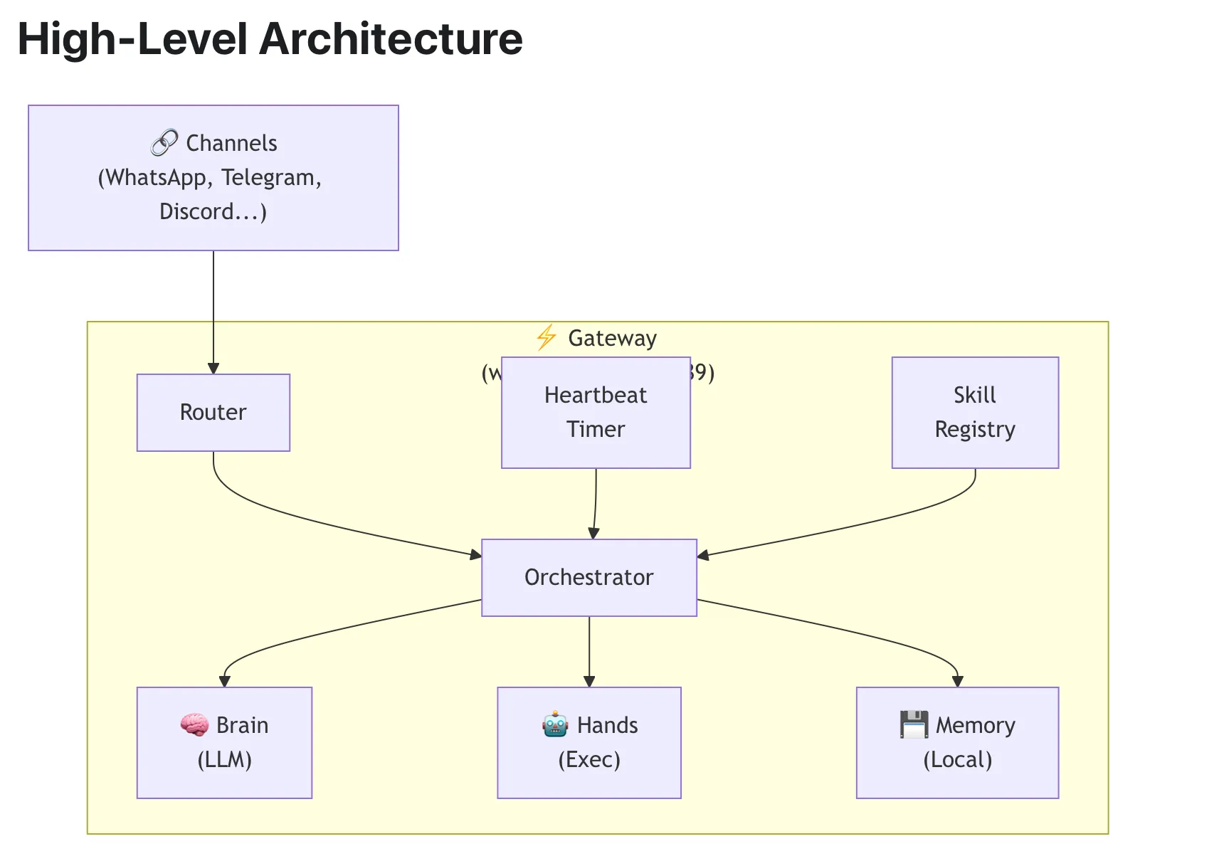 似乎一切都清晰明了,一个 Orchestrator(指挥官) 接收 Input (来自用户, Heartbeat Timer, Skill Registry…),然后调度 Brain, Hands 和 Memory。